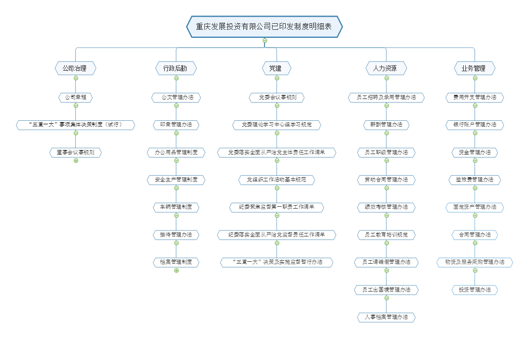 三是研究制定、精心组织实施公司内控制度建设计划。公司党委研究制定了公司首批内控制度计划。公司各部门按照“时间服从质量”的要求,精心组织实施内控制度计划,认真研究起草相关制度,确保制度质量。公司风险控制部加强对拟出台制度的合规性审查,牵头实施制度审批流程。目前,公司已出台制度34个,涵盖了公司治理、党建、行政后勤、人力资源、财务管理、资产管理、合同管理、招投标、投资管理等。为进一步完善公司内控制度体系,公司将对内控制度体系系统梳理、查漏补缺,适时出台后续内控制度建设计划,抓紧完成内控手册编制,织密内控体系网,确保公司生产经营有章可循、有序运转。